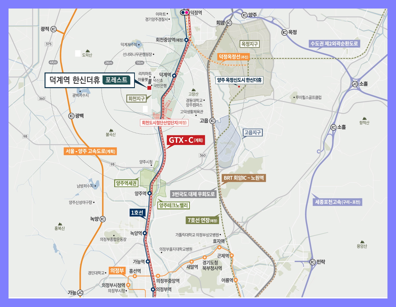 - 위치: 덕계역 한신더휴 포레스트는 경기도 양주시 덕계동 707-1번지에 위치해 있습니다. 수도권 1호선 덕계역과 매우 가까워 도보로 접근이 가능하며, GTX-C 노선이 2028년 덕정역에서 개통되어 서울 왕십리와 삼성역까지 빠르게 연결될 예정입니다.