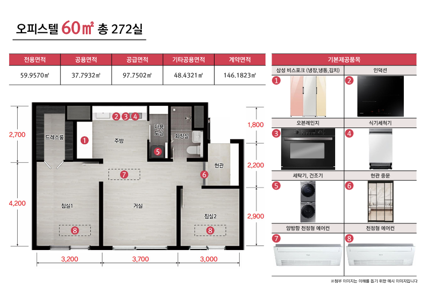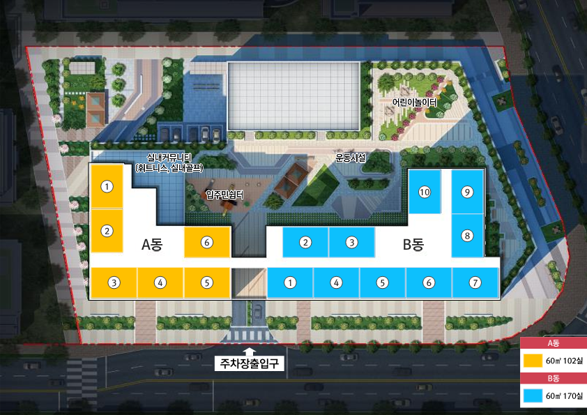 - 총 272세대, 전용면적 60제곱미터 투룸 삼성 가전의 풀옵션과 주거형에 맞는 어린이 놀이터 공간까지, 입주민 쉼터와 운동시설 모두 갖춘 명품 주거형 오피스텔