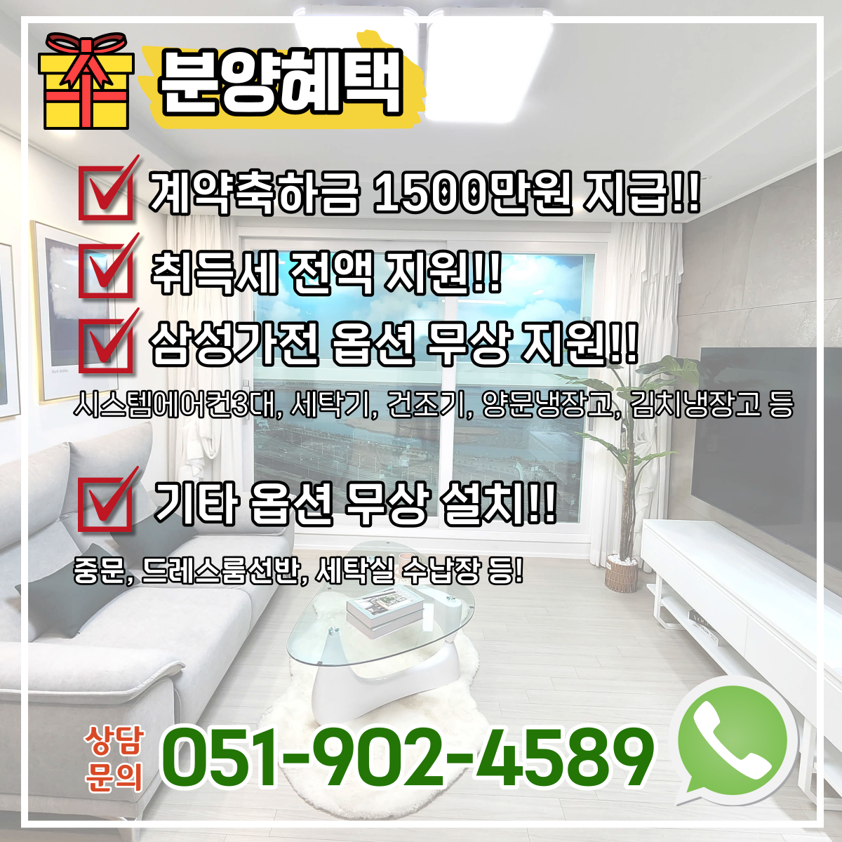현재 분양 혜택으로는, 계약축하금 1500만원 지급, 취득세 전액 지급, 삼성가전 옵션 무상지급