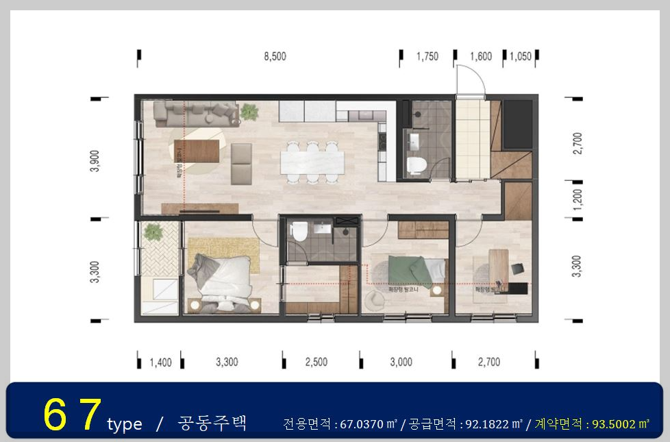 아파트는 총 56세대, 지하1층부터 지상 15층 규모입니다. 주차는 기계식 주차로 지하에 52대와 지상에 4대 주차가 가능합니다. 93.50㎡ (구 28평) 크기로, 구성은 방3, 거실1, 욕실2 입니다.